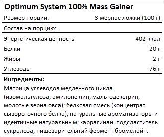 Гейнер Optimum System Mass подходит для людей, которым из-за особенностей обмена веществ сложно получить необходимую калорийность из обычной пищи. Он также рекомендован спортсменам, которым требуется повышенное потребление углеводов — до 6-8 граммов на 1 кг веса в день.