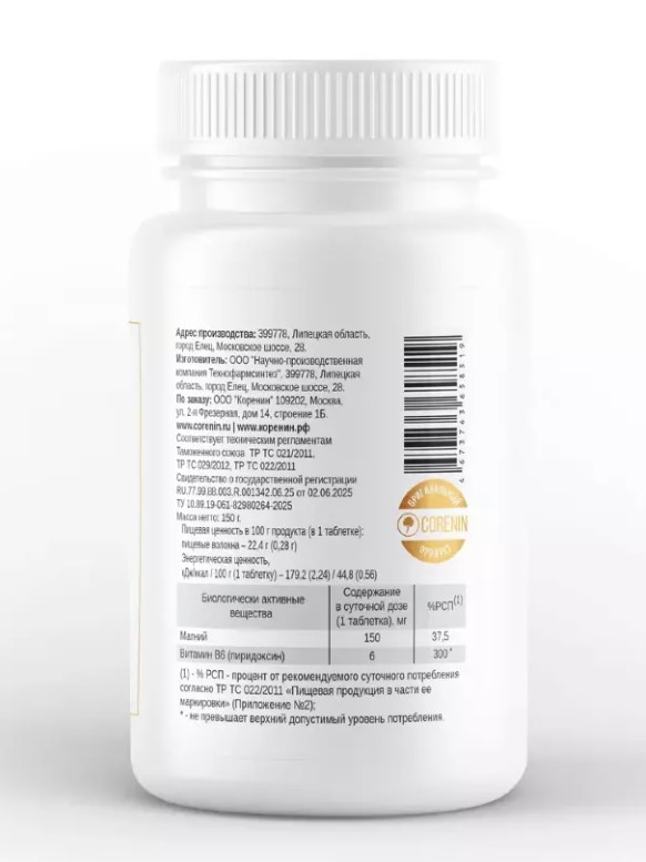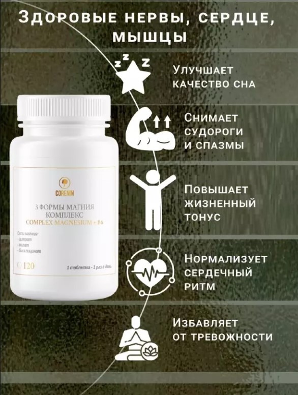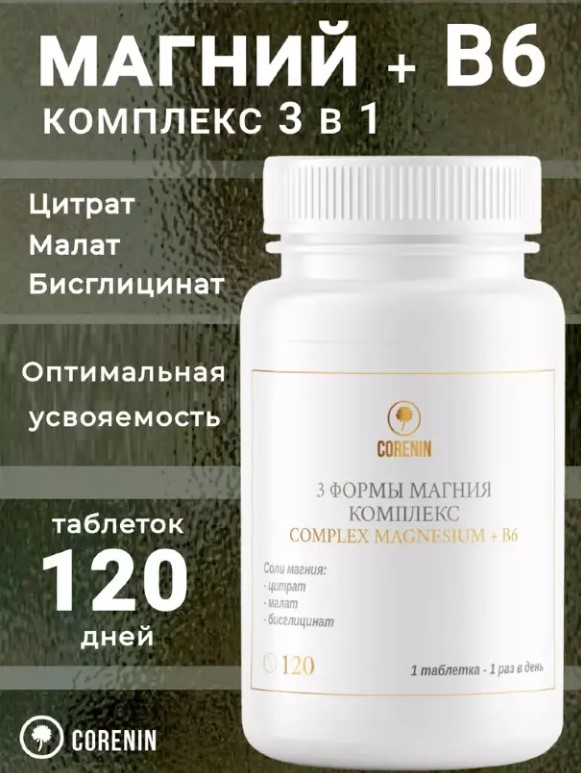 Магний + В6 от бренда Corenin — это высококачественная добавка, содержащая три формы магния и витамин B6, которая способствует поддержанию нормального функционирования организма. В каждой упаковке содержится 120 таблеток по 1250 мг, что обеспечивает длительный курс приема.