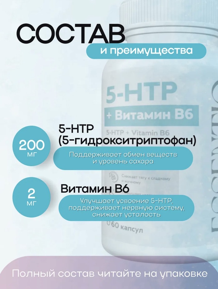 Наши бады в капсулах с триптофаном и витамином B6 являются мощным инструментом для нормализации психоэмоционального состояния и сна. Триптофан и НТР, входящий в состав, участвует в синтезе серотонина, что способствует снижению стресса и выступает в роли натурального антидепрессанта и успокоительного. Используйте их как часть своей ежедневной женской рутины для борьбы с бессонницей и как успокоительное или заменитель антидепрессантов. Подходит вместо снотворного для взрослых мужчин и женщин, сталкивающихся с трудностями засыпания или стрессовыми ситуациями. Каждая порция содержит 5 htp 200 мг, что усиливает производство серотонина, создавая благоприятные условия для сна и эмоционального равновесия. Наша формула в капсулах без труда интегрируется в ваш распорядок дня, предоставляя необходимую поддержку в период интеллектуальных нагрузок. Таблетка НТР с B6 ускоряет улучшение обменных процессов, поддерживая здоровье нервной системы и снижает аппетит, следовательно, помогает в похудении. Включите бады с витамином 5 htp в свой рацион и наблюдайте за изменением качества жизни. Достаточно одного приема витаминки в день взрослому человеку для поддержания организма, будь то молодой мужчина, так и любого возраста девушек. Очень легко наладить режим дня и ночи с данным витаминным комплексом благодаря снотворному действию. Похудение и понижение уровня стресса дастся быстрее. Сохрани свое здоровье сильным и крепким с витаминной таблеткой, начни уже сегодня. Женская природа сильная по своей натуре, но к ней нужно относиться бережно и с заботой. Особенно актуально это в послеродовое время, когда женщина ослаблена как морально, так и физически. Из продуктов люди обычно недобирают микроэлемны и часто это приводит к дефицитам. В осенне-весенний сезон эта проблема становится острее, после холодной зимы ресурсы зачастую истощены.