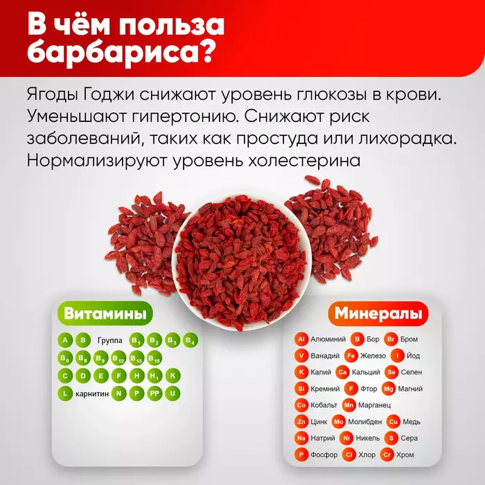• Высокое содержание антиоксидантов: Ягоды Годжи богаты антиоксидантами, которые помогают защищать клетки от свободных радикалов.