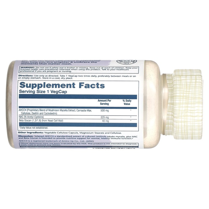 Solaray® AHCC® - это стандартизированный экстракт культивированного мицелия Lentinula edodes, а также NAC и бета-глюкан, предназначенный для обеспечения питательной поддержки нормальной, здоровой иммунной функции.