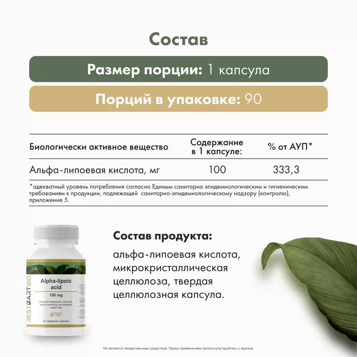 Альфа-липоевая кислота (100 мг) от бренда RestartBio — это мощный антиоксидант, который поддерживает обмен веществ и способствует улучшению энергетического уровня. В каждой упаковке содержится 90 капсул, что обеспечивает длительный курс приема.