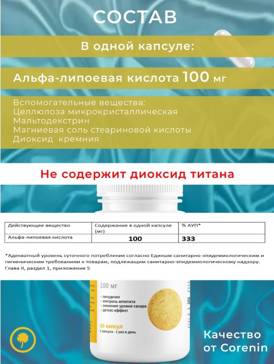 Альфа-Липоевая кислота от бренда Corenin — это мощный антиоксидант, который поддерживает обмен веществ и способствует улучшению энергетического уровня. В каждой упаковке содержится 60 капсул, что обеспечивает длительный курс приема.