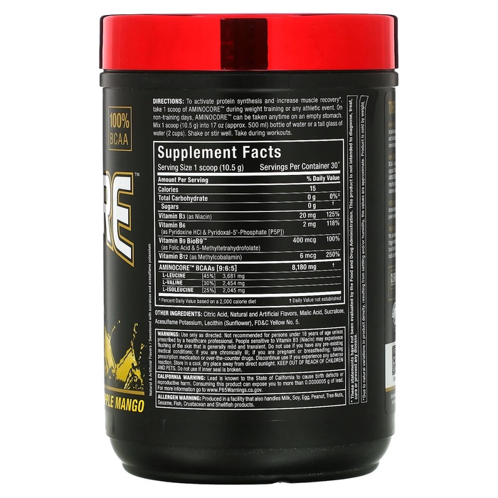 Зачем использовать Allmax Aminocore? Не все BCAA одинаковы. Смесь Aminocore содержит 8,18 г BCAA в соотношении 9:6:5, которое, как было клинически доказано, обеспечивает увеличение активации сигналов роста мышц на 350%! Aminocore — самый чистый источник BCAA в свободной форме, без наполнителей или аминокислот, не относящихся к BCAA. В Aminocore кислоты в соотношении 9:6:5 на 100% чисты до начала ароматизации. Обычные источники с содержанием 2:1:1 включают примеси, приводящие к помутнению, маслянистой пене, осадку и, что еще хуже, неприятному горькому вкусу! Aminocore - это самая чистая и вкусная добавка с разветвленной цепью, которую только можно купить за деньги!
