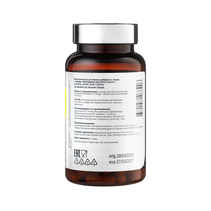 Alpha lipoic acid (АЛК) — универсальная поддержка для тех, кто хочет чувствовать себя моложе, активнее и здоровее.этот мощный антиоксидант замедляет старение, защищает клетки от повреждений и повышает уровень энергии.Основные компоненты (в 1 капсуле):липоевая кислота — 100 мг