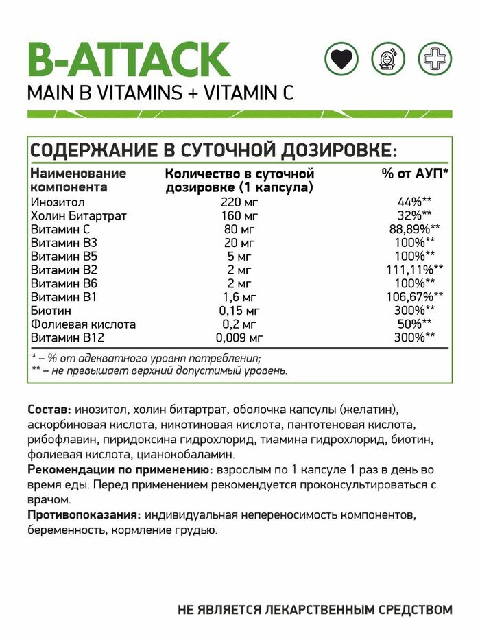Рекомендуется принимать по 1-2 капсулы B-Attack в день во время еды. Этот комплекс витаминов группы B помогает предотвратить дефицит этих витаминов, который может привести к усталости, нервному истощению и другим проблемам со здоровьем. Перед началом приема рекомендуется проконсультироваться с врачом, особенно если имеются какие-либо проблемы со здоровьем или принимаются другие лекарственные препараты.