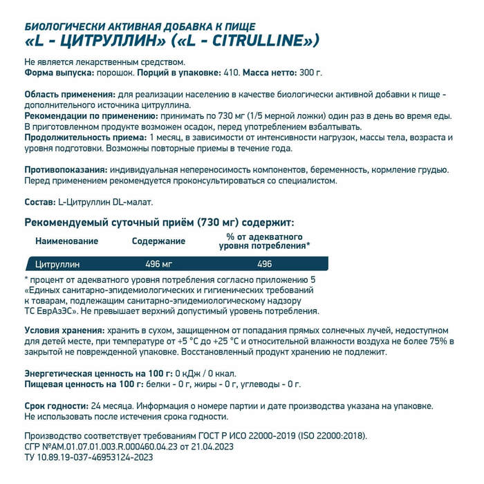 • Увеличение выносливости: Цитруллин способствует улучшению кровообращения и увеличению выносливости во время тренировок.