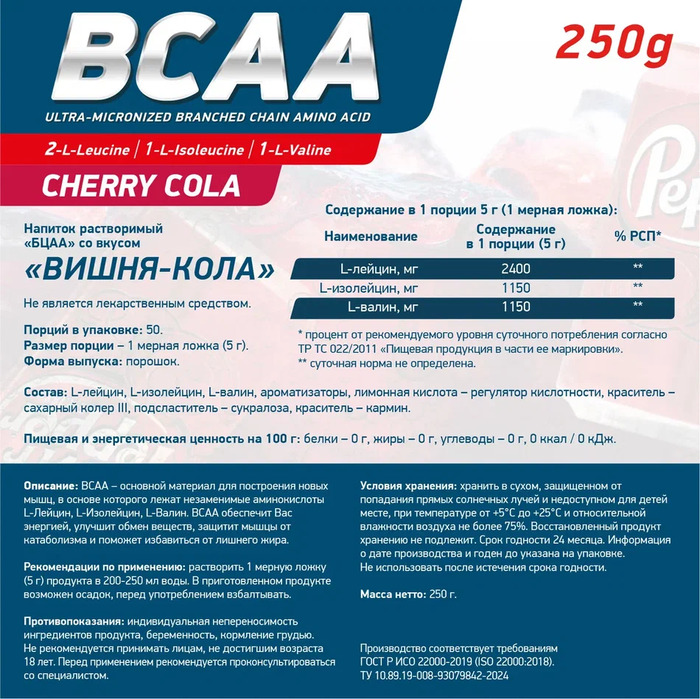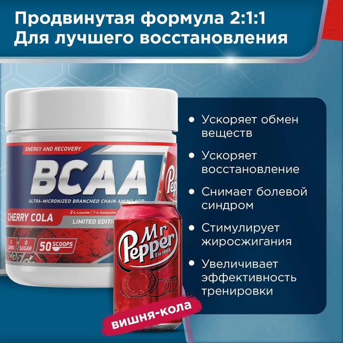 Аминокислота BCAA 2:1:1 Вишня-Кола от бренда Geneticlab — это высококачественный продукт, предназначенный для поддержки мышечного роста и восстановления. В каждой упаковке содержится 250 г порошка с освежающим вкусом вишни и колы, который легко растворяется в воде.