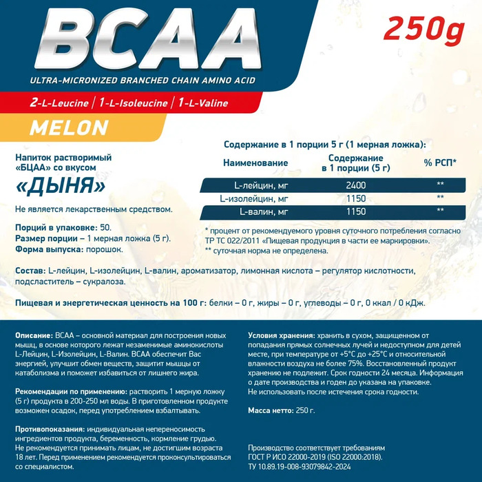 Аминокислоты BCAA 2:1:1 Дыня имеют высокую растворимость и быстро усваиваются организмом, что делает их идеальными для использования до, во время и после тренировки. Продукт подходит как для профессиональных спортсменов, так и для любителей фитнеса.