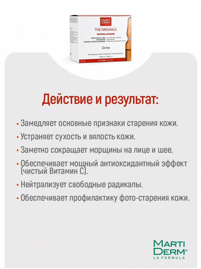 Ампулы с липосомами для лица и шеи MartiDerm The Originals Proteos Liposome — это высококачественный продукт, который обеспечивает интенсивное увлажнение и питание кожи. В каждой упаковке содержится 30 ампул по 2 мл, что позволяет легко и удобно использовать их в повседневном уходе.