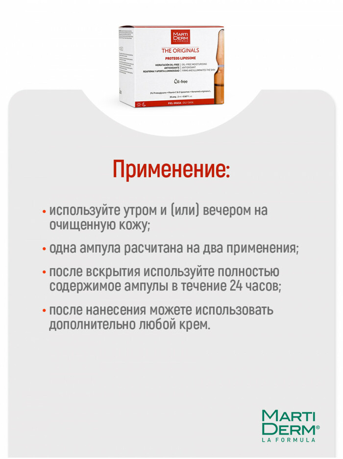Ампулы MartiDerm The Originals Proteos Liposome имеют легкую текстуру, которая быстро впитывается, не оставляя жирного блеска. Они идеально подходят для всех типов кожи и могут использоваться как в утреннем, так и в вечернем уходе.