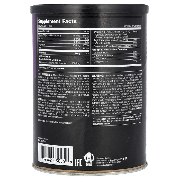 Animal PM® - это ежедневный набор, который максимизирует ваш прогресс даже в периоды отдыха. Сон имеет жизненно важное значение для работоспособности и восстановления. Каждая упаковка Animal PM® содержит необходимые комплексы и ингредиенты, которые способствуют росту мышц и обеспечивают качественный сон, обеспечивая эффективное восстановление мышц, регулирование гормонов, улучшение когнитивной функции, предотвращение травм и устойчивый уровень энергии. Animal PM® просыпает организм отдохнувшим и готовым к максимальной активности.
