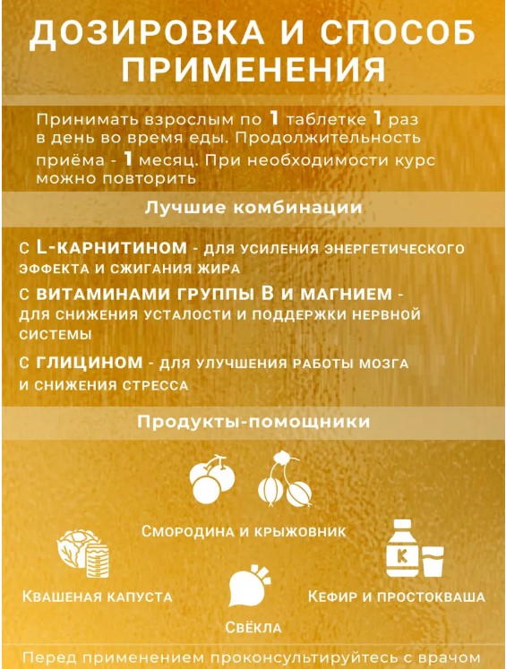 Таблетки легко проглатываются и не имеют выраженного вкуса, что делает их удобными для ежедневного приема. Рекомендуется использовать в периоды повышенных физических и умственных нагрузок.