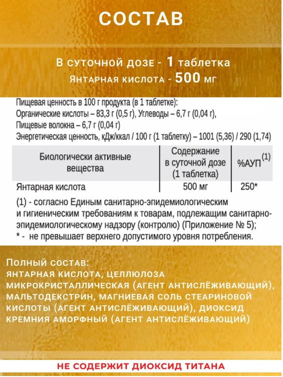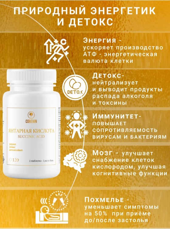 • Энергетическая поддержка: Янтарная кислота участвует в процессе выработки энергии на клеточном уровне, что помогает повысить физическую выносливость.