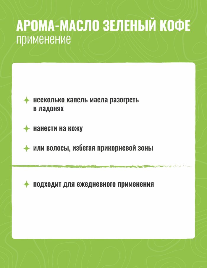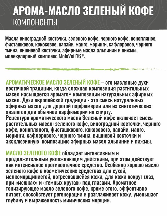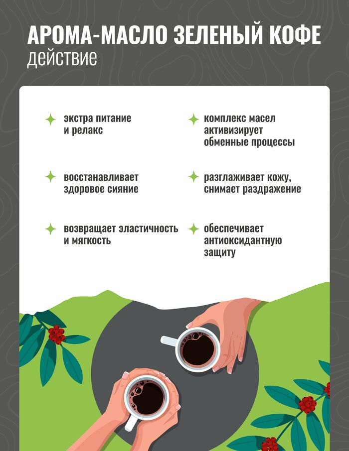 Масло по праву считается одним из самых питательных средств для кожи лица и тела. А если масло не одно, а несколько? А если этот микс еще и приправлен молекулярным комплексом? Тогда у вас в руках однозначно волшебное Арома-масло «Зеленый кофе»!Основными направлениями его действия являются: экстра-питание, релакс, ароматизация кожи и волос. Эксклюзивный комплекс 100% натуральных масел активизирует обменные процессы, восстанавливает здоровое сияние.Название дано средству не случайно – в число первых трех компонентов входят, помимо масла виноградной косточки, масла зеленого и черного кофе. Кофеин в их составе обеспечивает ярко-выраженный лифтинг-эффект, в связи с чем Арома-масло активно борется с возрастной дряблостью кожи лица, а также с признаками целлюлита при комплексном подходе к решению этой проблемы.Аминокислоты, входящие в состав масла зеленого кофе, обеспечивает антиоксидантную защиту, а полиненасыщенные кислоты отвечают за anti-age-эффект и препятствуют старению, восстанавливая верхние слои кожи.Масла манго и кокоса разглаживают кожу, снимают раздражение, возвращают эластичность и мягкость. Обладают ярковыраженным антивозрастным действием, заметно сокращая глубину морщин.Неоценима польза этих масел и для волос – они наполняют их живительной влагой и полезными микроэлементами, укрепляя каждый волосок, приводят в порядок секущиеся кончики, избавляя волосы от ломкости и сухости.Масло папайи содержит особый энзим, который регулирует выделения кожного жира – матирует кожу, очищает и способствует ее регенерации. Также оно разглаживает и укрепляет волосы, дарит им головокружительный блеск и гладкость.