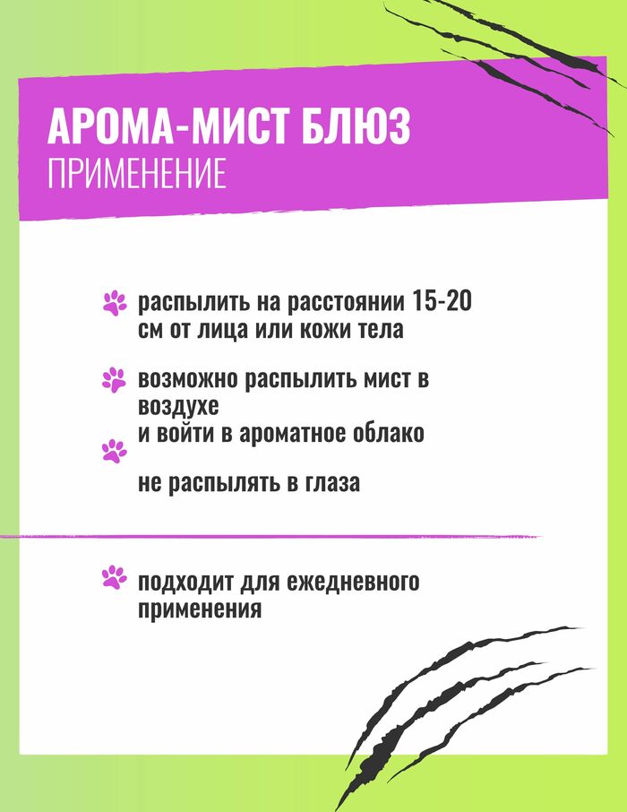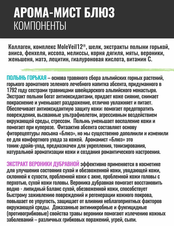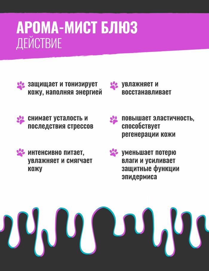 Арома-мист «Блюз» инновационный тоник для кожи. Увлажнение, восстановление, релакс, тонус Суета очередного дня позади, мягкой кошачьей лапкой в окно стучится вечер и наступает время возрождения. Самым верным решением будет провести эти минуты с арома-мистом для кожи «Блюз», который поможет прийти в себя и стряхнуть флер усталости как с души, так и с кожи. Лиричный и одновременно источающий драйв, тоник-спрей серии Wild Cat вернет уставшей коже лица тонус и окажет релаксирующее воздействие.Инновационный арома-мист и драйв-уход «Блюз» предназначен для ежедневного ухода за кожей любого типа. Активный состав с высокой концентрацией фито-компонентов мгновенно впитывается и увлажняет кожу, снимая последствия усталости и стресса. Приятным дополнением станет шлейф ароматической 3D-вуали, расслабляющей и создающей романтическое настроение.Мириады капелек легчайшим душем, таким живительным и желанным, оросят уставшую кожу, даря свежесть и окутывая звонким ароматом спелых фруктов. «Блюз» элегантен, в меру сладок и не слащав, силы его аккордов достаточно, чтобы смыть налет утомленности и подарить ощущение драйва. В то же время он не нарушит планов размеренного вечера и, возродив и расслабив, призовет в царство Морфея.Арома-уход «Блюз» выпускается в формате спрея. Стильный флакон из черного пластика оснащен удобным дозатором-распылителем, который позволит нанести средство щедрой вуалью в считанные секунды.Арома-мист уже успели оценить профессиональные визажисты и косметологи.