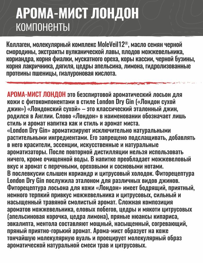 Коллаген, молекулярный комплекс MoleVeil12®️, масло семян черной смородины, экстракты вулканической лавы, плодов можжевельника, кориандра, корня фиалки, мускатного ореха, коры кассии, черной бузины, корня лакричника, дягиля, цедры апельсина, лимона, гидролизованные протеины пшеницы, гиалуроновая кислота.