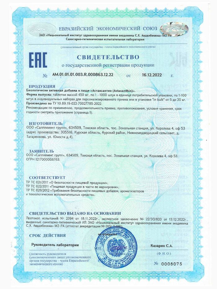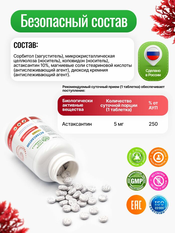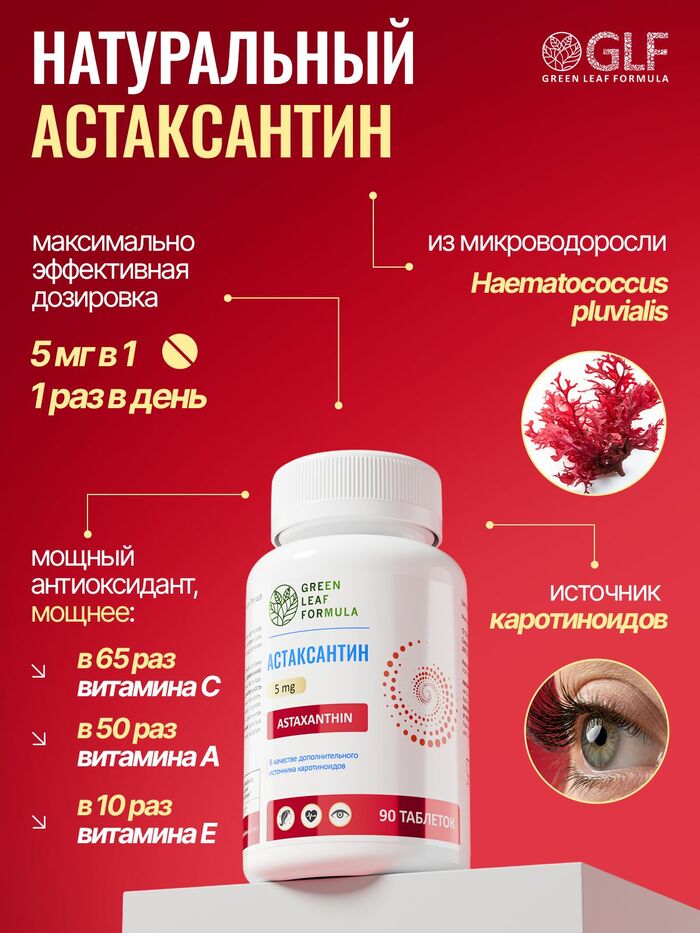 Астаксантин - один из самых сильных природных антиоксидантов. Он помогает защищать клетки организма от окислительного процесса, поддерживает здоровье кожи, сетчатку глаза, защищает от фотостарения, поддерживает здоровье сосудов и иммунитет.Натуральный астаксантин из микроводоросли Haematococcus pluvialis – это источник каротиноидов.1 таблетка содержит максимально эффективную дозировку 5 мг, удобно принимать 1 раз в день.Показания к применению:Защита клеток от окислительного стресса, связанного со старением, воспалением и различными заболеваниями.Поддержка здоровья кожи, увлажнение и защита от УФ-излучения.Питание глаз, защита от разрушения сетчатки при работе за компьютером, при УФ-лучах.Поддержка здоровья сосудов, улучшая функцию эндотелия (внутренней поверхности) и снижая окисление ЛПНП — «плохого» холестерина.Ускорение восстановление организма и повышение выносливости.Противопоказания: индивидуальная непереносимость компонентов БАД, беременность, кормлениегрудью. Перед применением рекомендуется проконсультироваться с врачом.