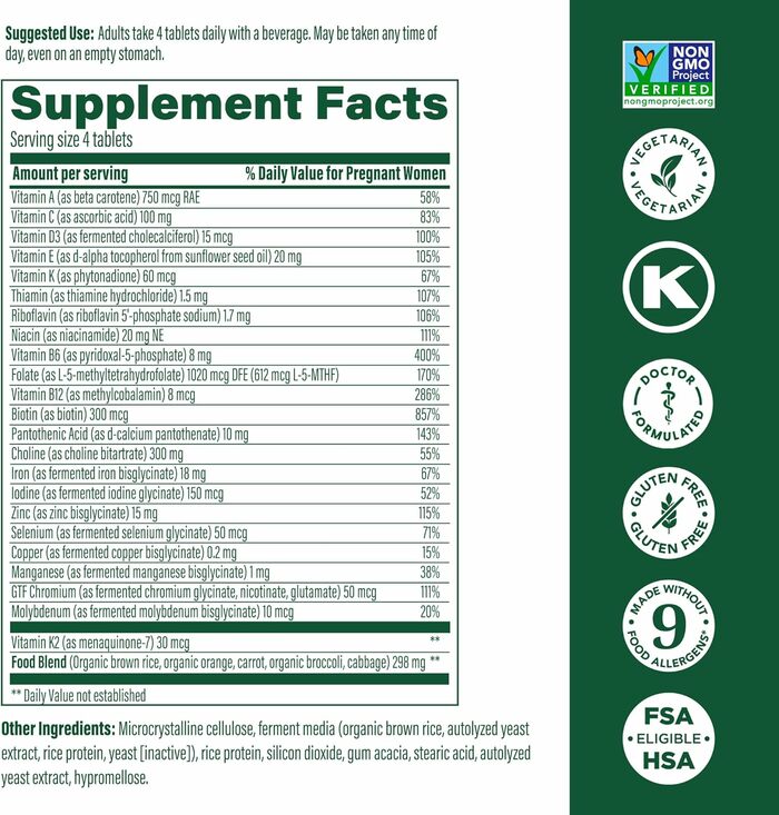 Комплекс пренатальных мультивитаминов Baby & Me 2 от MegaFood обеспечивает оптимальное количество питательных веществ до и во время беременности благодаря содержанию 23 питательных веществ и натуральных продуктов. Метилированный фолат (активная форма фолиевой кислоты) и холин помогают поддерживать развитие головного и спинного мозга.