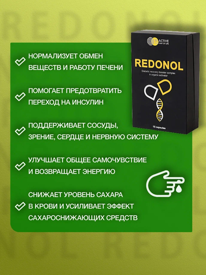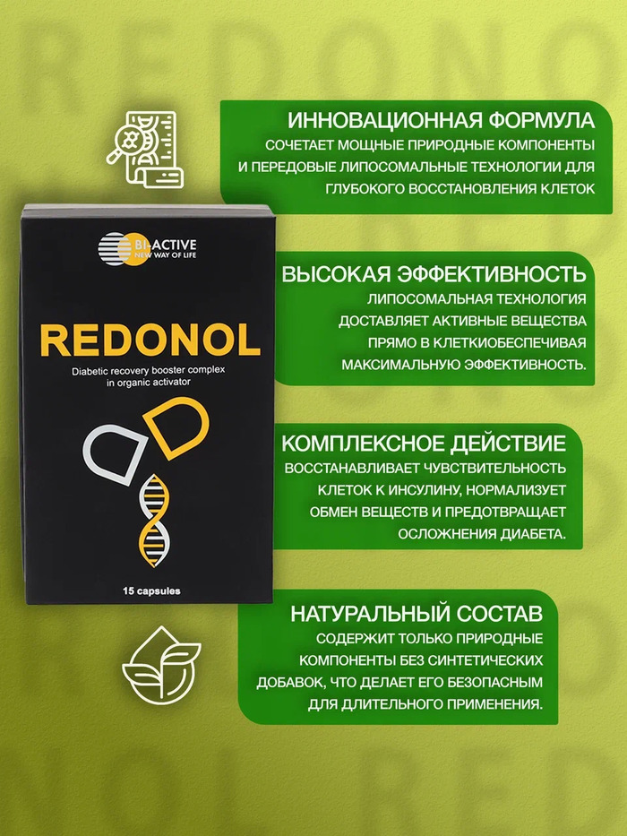 БиАктив Редонол Bi-ACTIVE REDONOL — это специализированный биологически активный добавок, разработанный для поддержки людей с сахарным диабетом 2 типа и метаболическим синдромом. В каждой упаковке содержится 30 капсул в масле, которые помогают улучшить обмен веществ и поддерживать нормальный уровень сахара в крови.