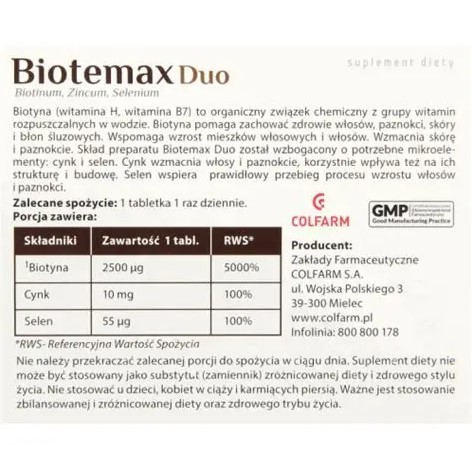 БАД Colfarm Biotemax Duo для красивых волос, кожи и ногтей — это идеальное решение для поддержания красоты и здоровья ваших волос, кожи и ногтей. В каждой упаковке содержится 60 таблеток, которые обеспечивают ваш организм необходимыми витаминами и минералами.