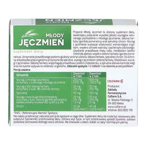БАД Colfarm Junge Gerste Młody Jęczmień — это высококачественный продукт, содержащий экстракт молодого ячменя в форме таблеток. В каждой упаковке находится 60 таблеток по 6250 мг, что делает его удобным для ежедневного использования.
