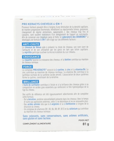 БАД Granions Pro Keracys 4-в-1 — это эффективное средство против выпадения волос, которое способствует их силе и росту. В каждой упаковке содержится 30 капсул, которые обеспечивают комплексный подход к уходу за волосами.