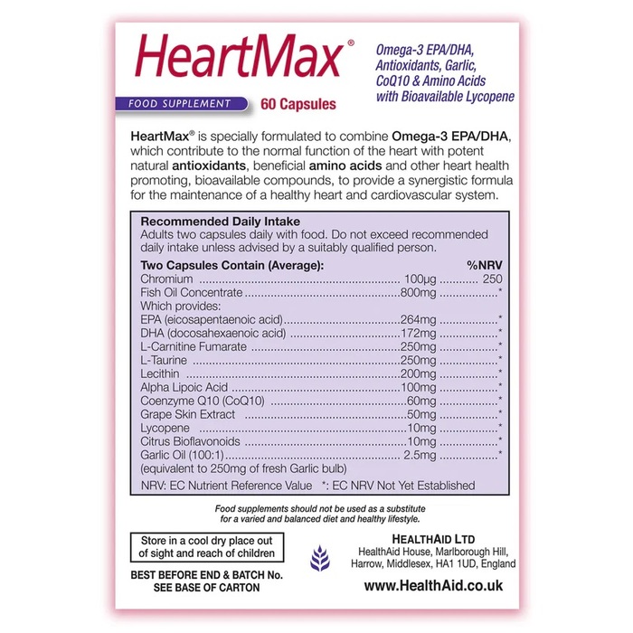 БАД Health Aid Heartmax — это высококачественный комплекс, разработанный для поддержки здоровья сердечно-сосудистой системы. В каждой упаковке содержится 60 капсул, которые обеспечивают организм необходимыми компонентами для нормального функционирования сердца.
