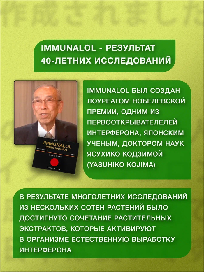 БАД Иммуналол Immunalol — это японский индуктор интерферона, который помогает поддерживать иммунную систему и защищает организм от вирусов и инфекций. В каждой упаковке содержится 30 саше, что делает его удобным для использования в любое время.