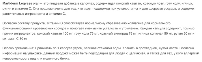 Капсулы Martiderm Legvass Oral имеют оптимально подобранный состав, который подходит для ежедневного использования. Продукт рекомендуется для людей, ведущих активный образ жизни, а также для тех, кто много времени проводит на ногах.