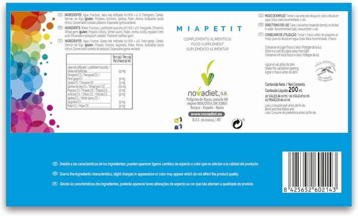 Novadiet БАД Miapetit Viales с маточным молочком, пажитником, корицей и зародышами пшеницы, 15 флаконов