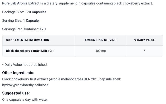 БАД Pure Lab Aronia Extract 400mg — это высококачественный экстракт аронии, который предлагает мощную поддержку для вашего организма. В каждой упаковке содержится 170 капсул, каждая из которых содержит 400 мг экстракта аронии.