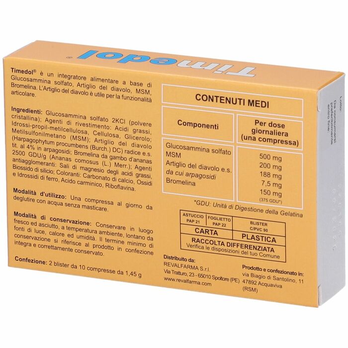 БАД Timedol Revalfarma с глюкозамином и дьявольским когтем — это эффективное средство для поддержания здоровья суставов и опорно-двигательного аппарата. В каждой упаковке содержится 60 капсул, которые обеспечивают организм необходимыми компонентами для поддержания подвижности и комфорта в суставах.