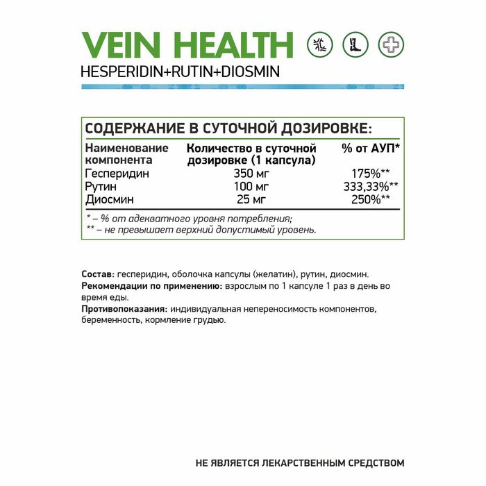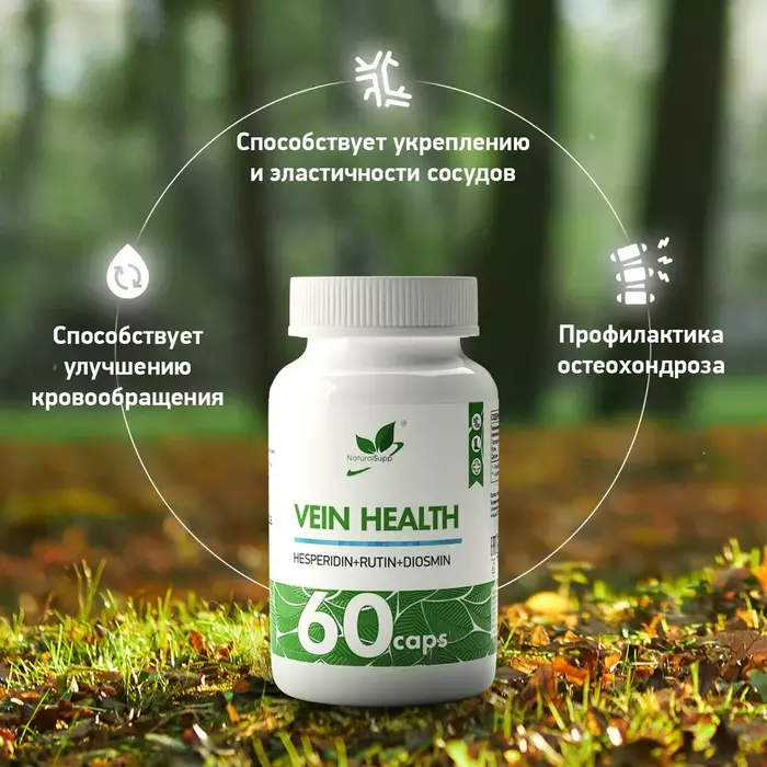 NaturalSupp БАД Здоровье вен — это уникальное средство, созданное на основе действенного сочетания таких натуральных компонентов, как диосмин (25мг), гесперидин (350мг) и рутин (100мг), которые способствуют поддержанию здоровья сосудов и улучшению состояния вен. Эти активные ингредиенты помогают укрепить стенки кровеносных сосудов, улучшить их эластичность и устранить отечность, что особенно актуально для людей, страдающих от варикозного расширения вен.
