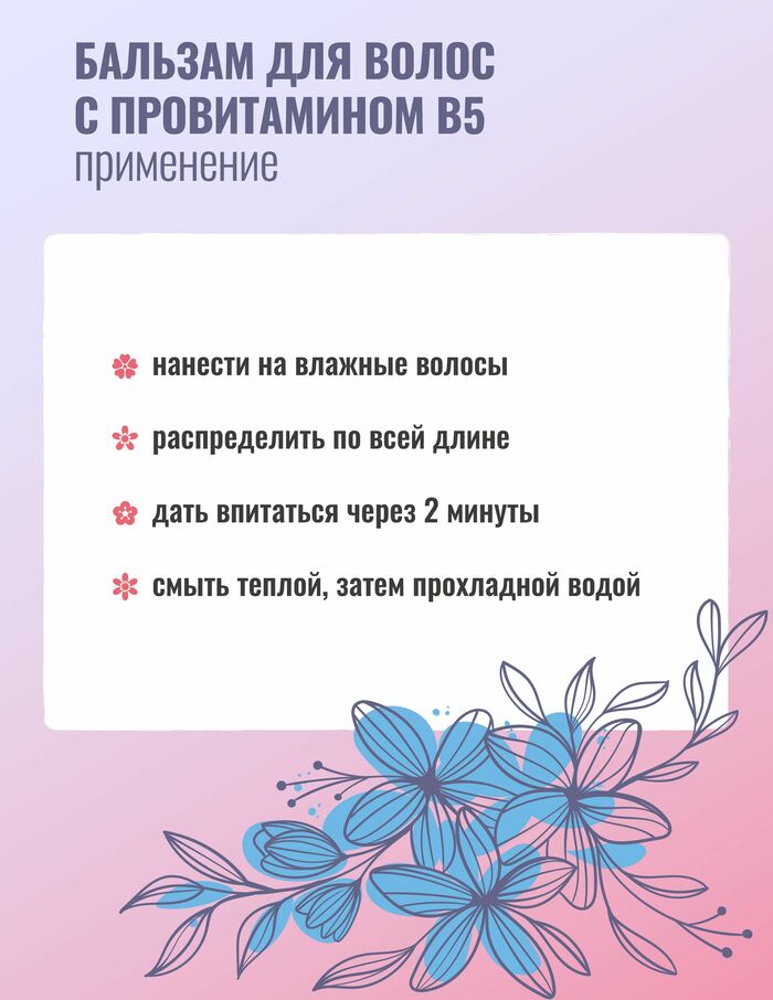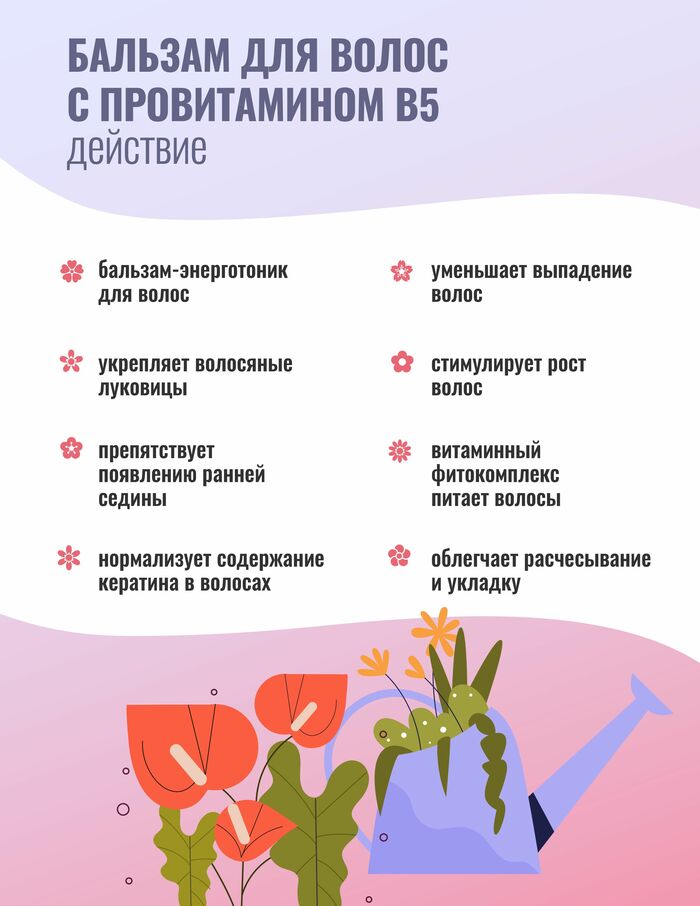 • Укрепляющий уход: провитамин B5 помогает укреплять волосы по длине и улучшать их состояние.