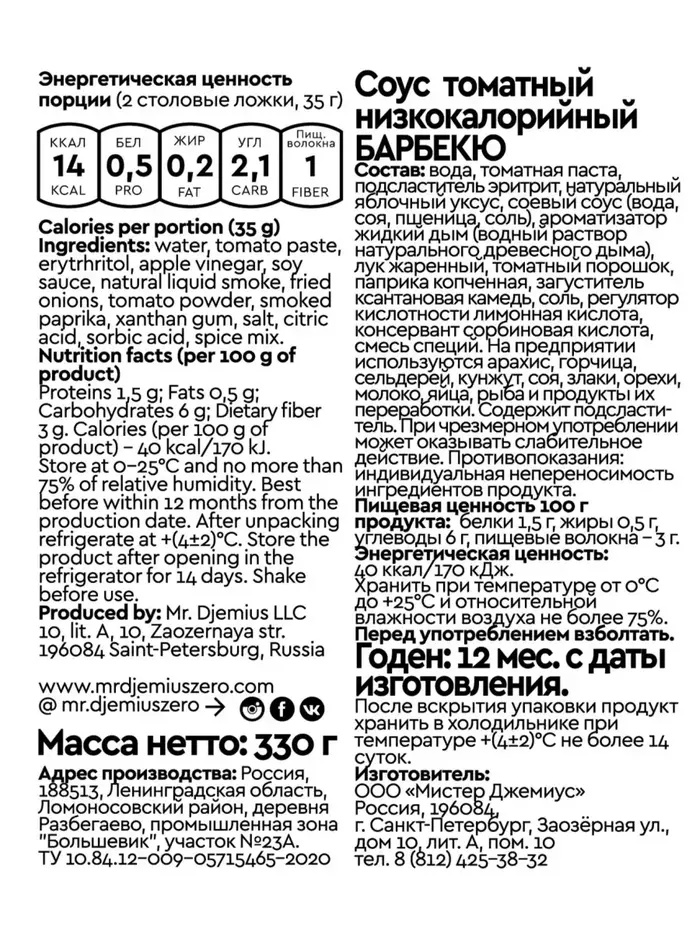 Mr. Djemius Соус низкокалорийный без сахара Барбекю, 330 мл