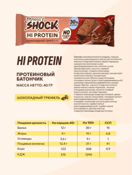 FitnesSHOCK Батончик разработан с учетом потребностей людей, ведущих активный образ жизни. Он не только утоляет голод, но и поддерживает организм в тонусе благодаря сбалансированному составу. Продукт подходит для вегетарианцев и не содержит искусственных красителей и консервантов.