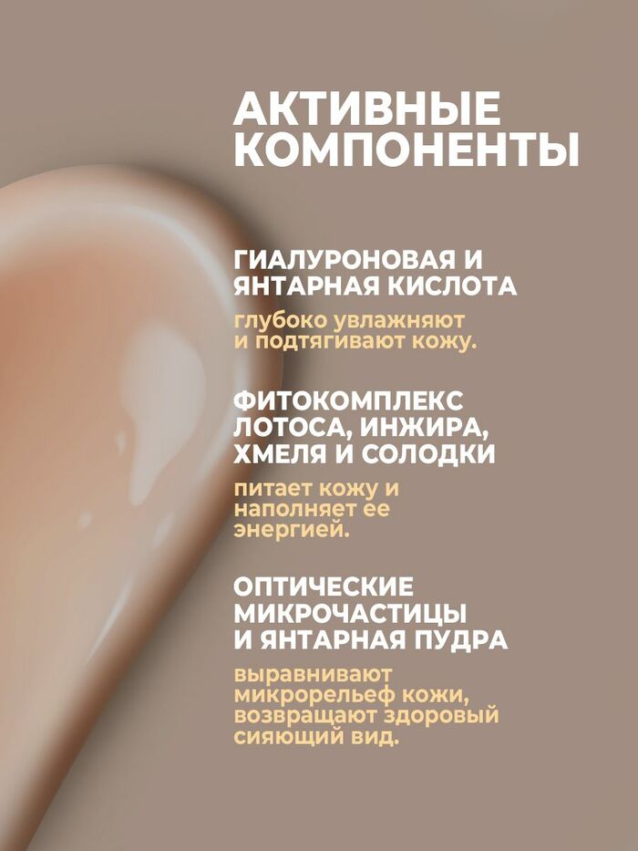 Увлажнение, выравнивает тон кожи, тонус, anti-age, подтягивает кожу, ANTI UVA, ANTI UVB, SPF 20, PA++Разделы: Лицо, ВсеНазначение: для кожи любого типа.Действие: выравнивает тон, цвет кожи, увлажняет, омолаживает, освежает и подтягивает кожу, убирает мелкие воспаления, предотвращает фотостарение, возвращает здоровый внешний вид.Применение: нанести подушечками пальцев тонким слоем на очищенную увлажненную кожу легкими прикосновениями, равномерно распределяя.Активные ингридиенты: пептидный комплекс бальзам «Плацентоль 100%»®, масло амарантовое, масло жжоба, экстракт солодки, хмеля, инжира, лотоса, коллаген, гиалуроновая кислота, янтарная кислота, янтарная пудра.