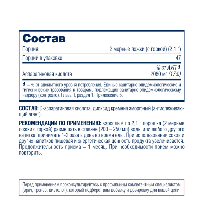 На одну порцию (2 мерные ложки (с горкой) - 2,1 гр): аспарагиновая кислота-2080 мг. Состав: D-аспарагиновая кислота, диоксид кремния аморфный (антислеживающий агент).