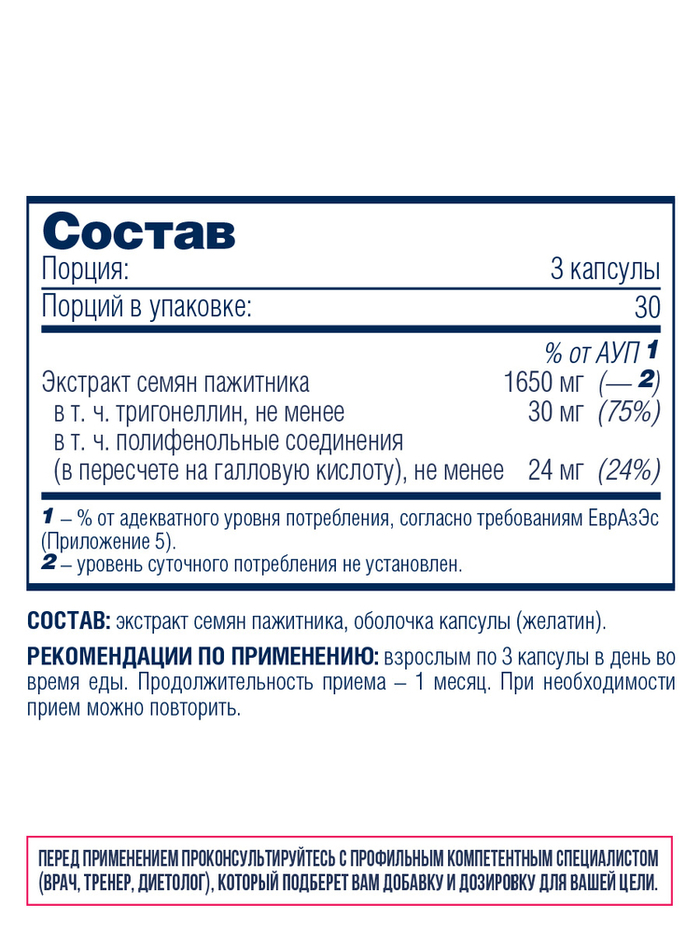 Состав на порцию 3 капсулы (каждая массой 550 мг): экстракт семян пажитника - 1650 мг (в т. ч. тригонеллин, не менее - 30 мг, в т. ч. полифенольные соединения (в пересчете на галловую кислоту - 24 мг) . Состав: экстракт семян пажитника, оболочка капсулы (желатин).