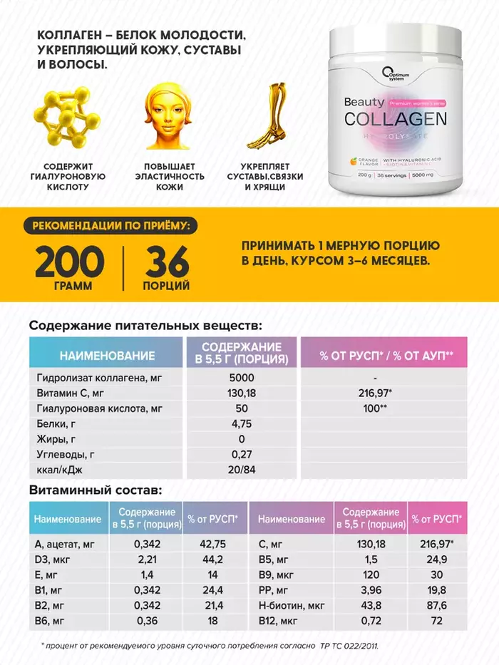 Приятный апельсиновый вкус и удобная форма порошка позволяют легко добавлять добавку в напитки или пищу. Упаковка из 200 г обеспечивает продолжительный курс, помогая поддерживать здоровье кожи и улучшить ее внешний вид.