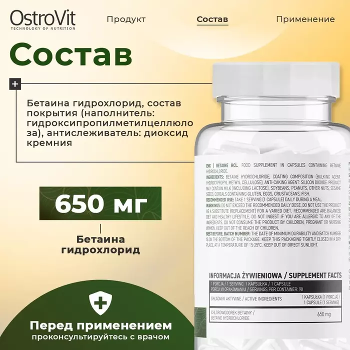 Бетаин Гидрохлорид Ostrovit Betaine HCl 650 мг — это высококачественная добавка, предназначенная для поддержки пищеварительной системы. В каждой упаковке содержится 90 капсул, что обеспечивает длительный курс приема.