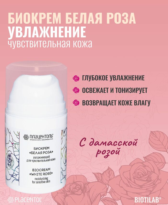 Биокрем Белая роза для чувствительной кожи Плацентоль сочетает увлажняющий, питательный, тонизирующий и освежающий уход в одном средстве, помогая поддерживать гладкость и мягкость. Подходит для регулярного применения в течение дня и для ухода в любое время года.