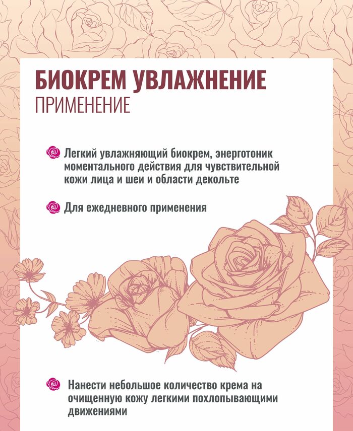 Нанести небольшое количество крема на очищенную кожу легкими похлопывающими движениями. Перед применением средства рекомендуется использовать биолосьон-энерготоник «Белая роза».