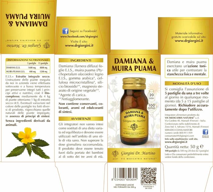 Биологически активная добавка Dr. Giorgini Damiana & Muira Puama в таблетках — это уникальный продукт, который сочетает в себе натуральные компоненты для поддержания здоровья. В каждой упаковке содержится 50 г таблеток, которые легко принимать и которые помогут вам в повседневной жизни.