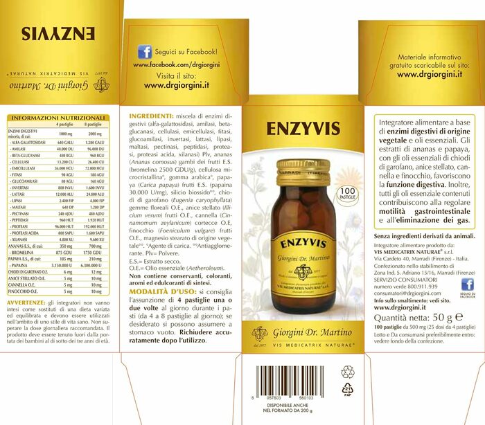 Таблетки Dr. Giorgini Enzyvis легко проглатываются и подходят для ежедневного использования. Рекомендуется применять добавку в периоды повышенных нагрузок на пищеварительную систему или при изменении рациона питания.