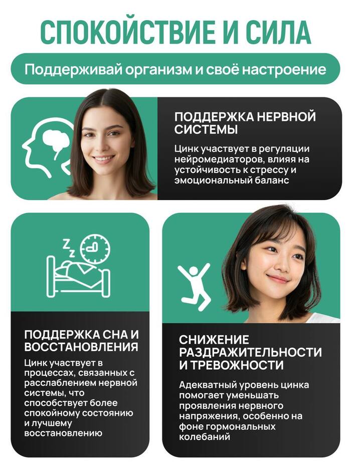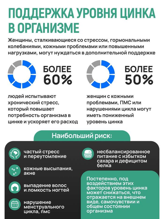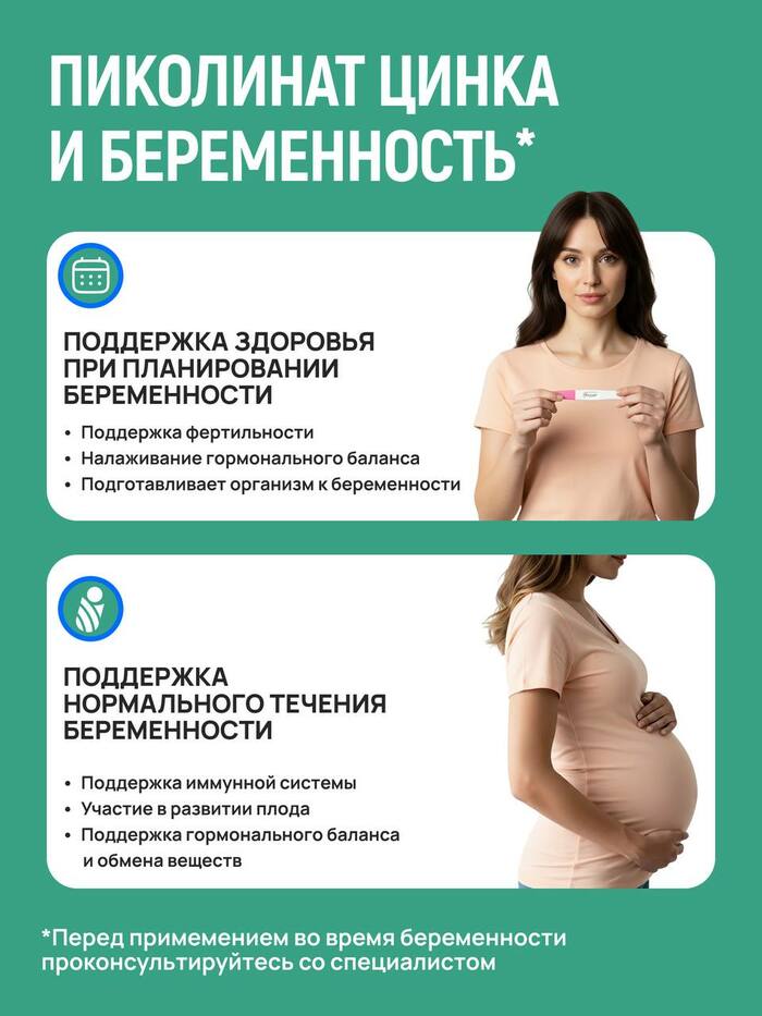 • Поддержка репродуктивной функции: Цинк важен для поддержания здоровья половой системы как у мужчин, так и у женщин.