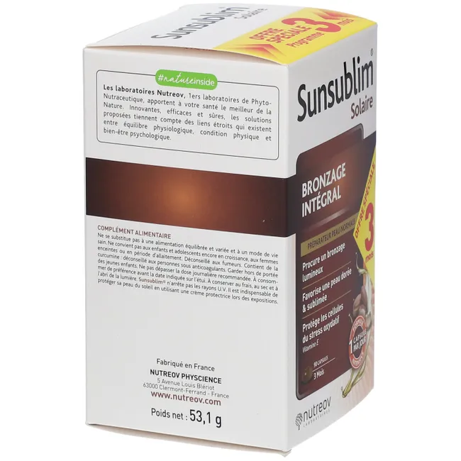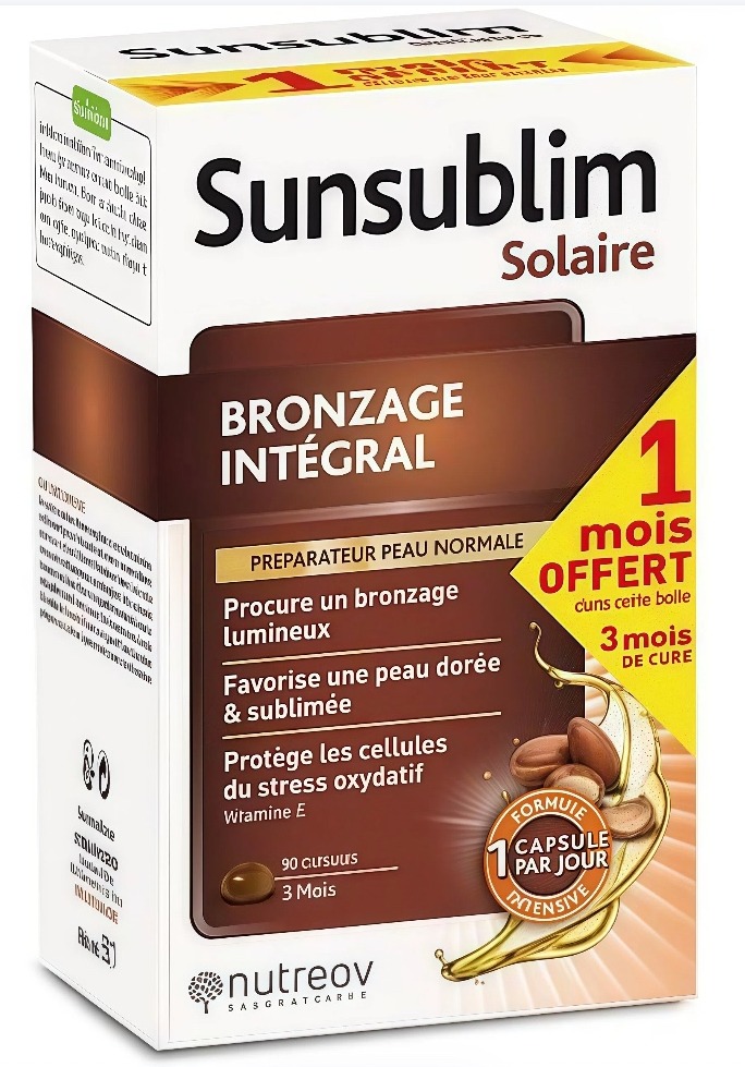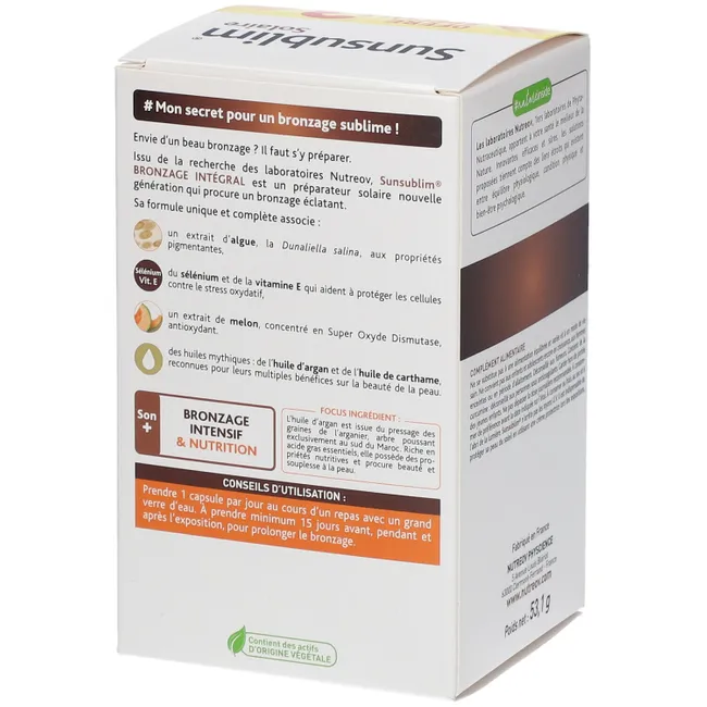 Биологически активная добавка Nutreov Sunsublim для загара с активными компонентами — это идеальное решение для тех, кто хочет получить красивый и ровный загар. В каждой упаковке содержится тщательно подобранный комплекс активных ингредиентов, который поддерживает здоровье кожи во время загара.