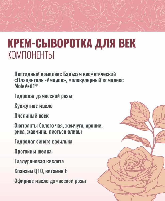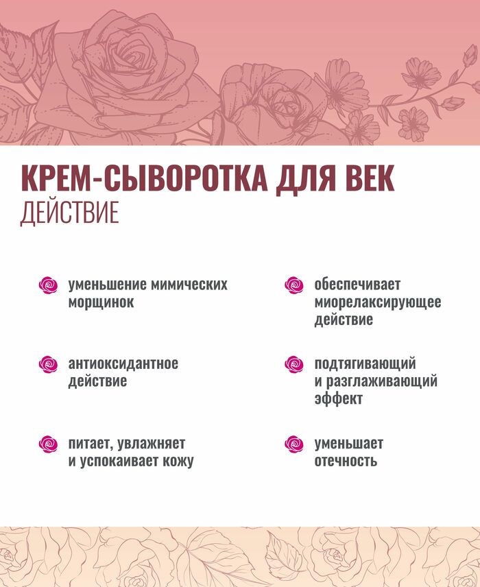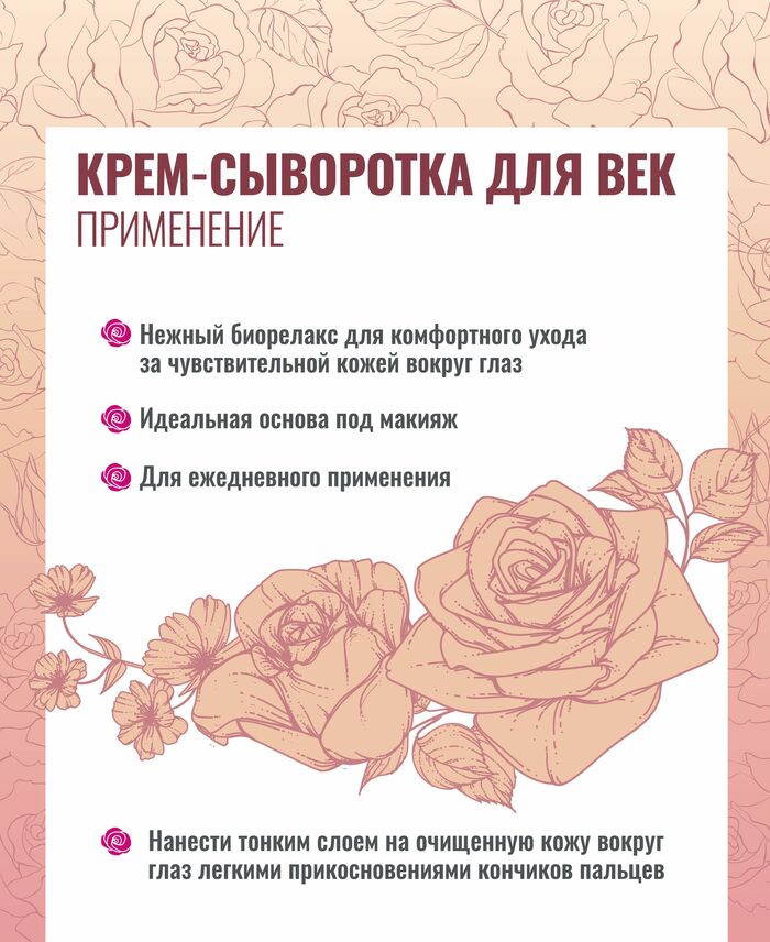 Крем-сыворотка вокруг глаз Биорелакс «Чайная роза» для чувствительной кожи — это антивозрастный увлажняющий уход, который помогает поддерживать комфортное состояние кожи и визуально улучшать внешний вид зоны вокруг глаз.