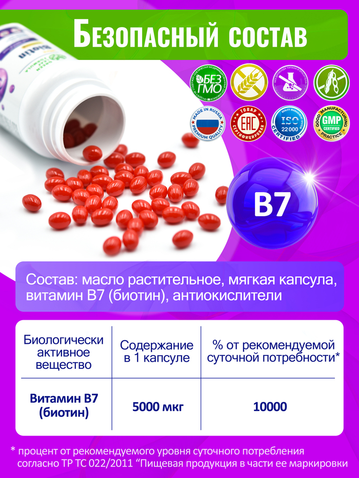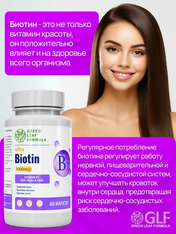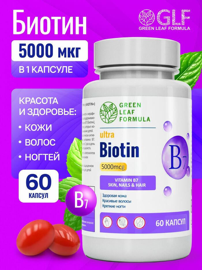 Биотин 5000 (5000 мкг) от GREEN LEAF FORMULA — это высококачественная добавка, предназначенная для поддержания здоровья волос, кожи и ногтей. В каждой упаковке содержится 60 капсул, что обеспечивает длительный курс приема.
